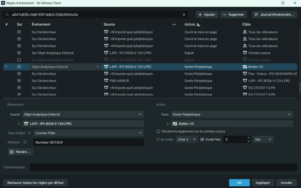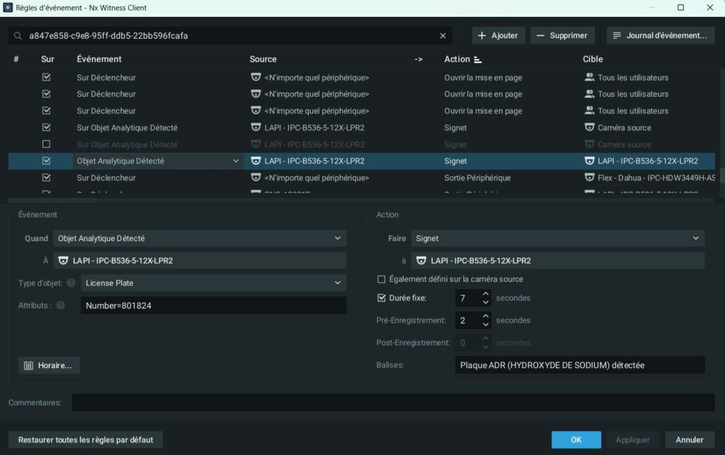 Il est possible de créer des règles d’automatisation dans Nx Witness à partir de la détection d’une plaque ADR spécifique ou d’un type de plaque. Par exemple :