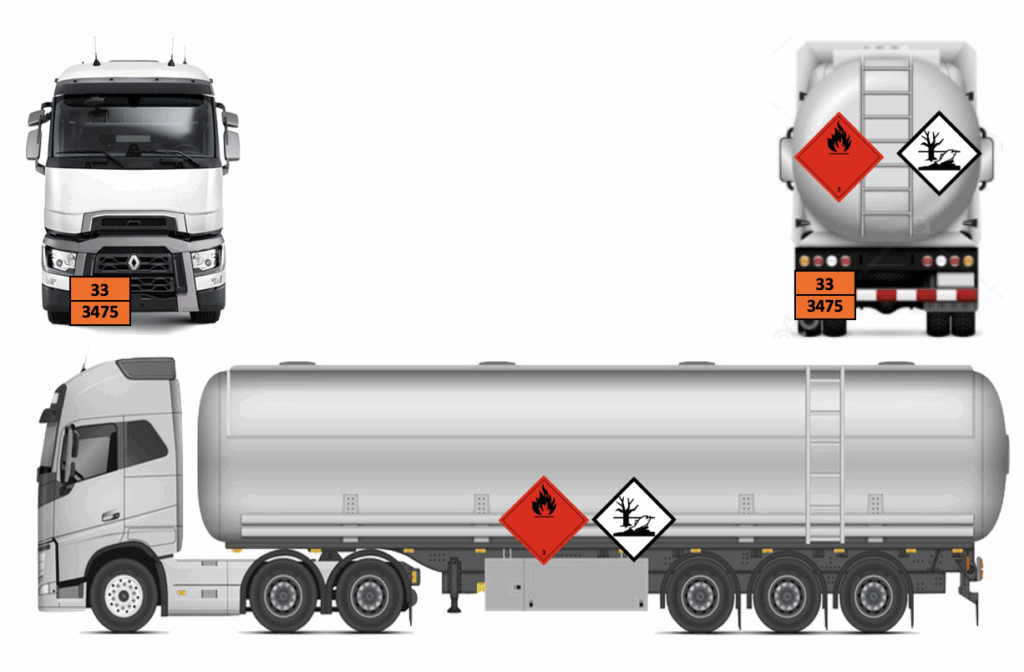 Un numéro en haut (numéro de danger, dit code Kemler) : indique la nature du risque (exemple : 33 = liquide très inflammable).