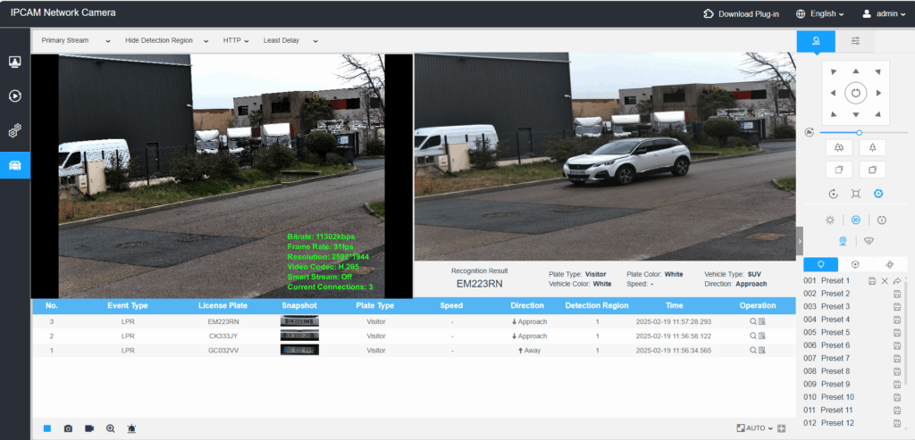 - Affichage en temps réel des plaques et des métadonnées associées (type, couleur, marque, direction, ADR).