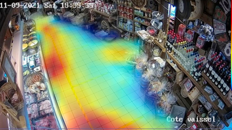 Visualisation des zones les plus fréquentées dans le magasin, utile pour ajuster les parcours clients et le merchandising. Nous sommes en mesure de réaliser ce travail sur des caméras Fisheye mais aussi sur des caméras classiques.