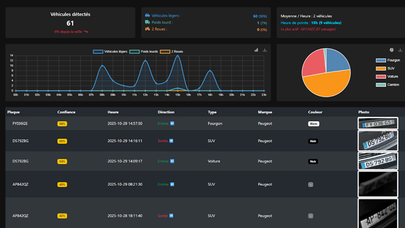 Le système proposé est capable de détecter plusieurs dizaines de véhicules en simultané, leur type, et leur couleur, et de suivre leur temps de présence en permanence, vous êtes ainsi capable d’être notifié si un véhicule stationne devant votre entrée ou encore au niveau des livraisons.