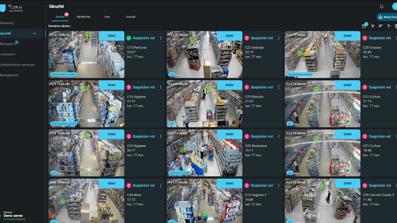 Grâce à l’IA, le système identifie les gestes ou attitudes pouvant indiquer un vol (produit dissimulé dans une veste ou un sac, ouverture produit dans le magasin) et remonter l’information en temps réel vers votre service de sécurité qui pourra vérifier, contrôler et noter l’événement pour un apprentissage permanent.