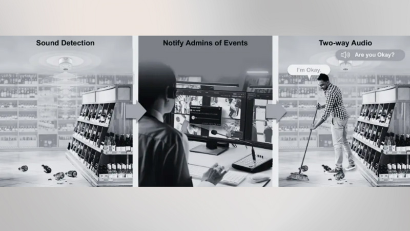 Technologie basée sur un microphone + IA permet de détecter des hausses de sons, des cris ou encore du bruit de verre. Une technologie plébiscitée par le secteur du retail pour gérer les incivilités à l’accueil par exemple. L’alerte peut être sonore (haut parleur) et/ou visuelle (led) et/ou confidentielle, tout en étant annotée dans votre système vidéo.