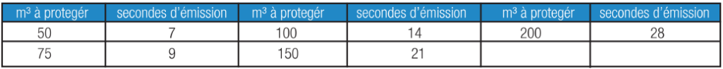 La première colonne montre le volume de la surface à protéger, dans la seconde, le temps d’émission requis en secondes.
