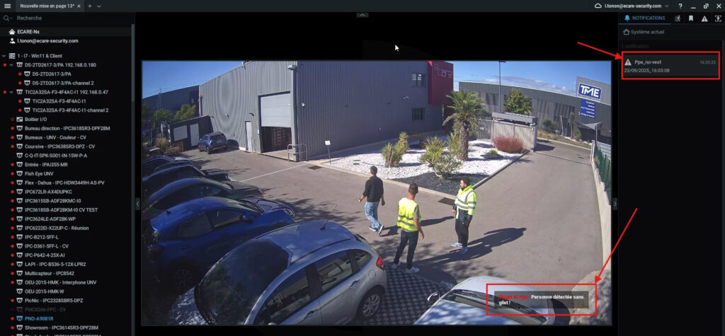 Exemple de détection automatisée du non-port des EPI dans Nx Witness avec affichage d’une alerte :